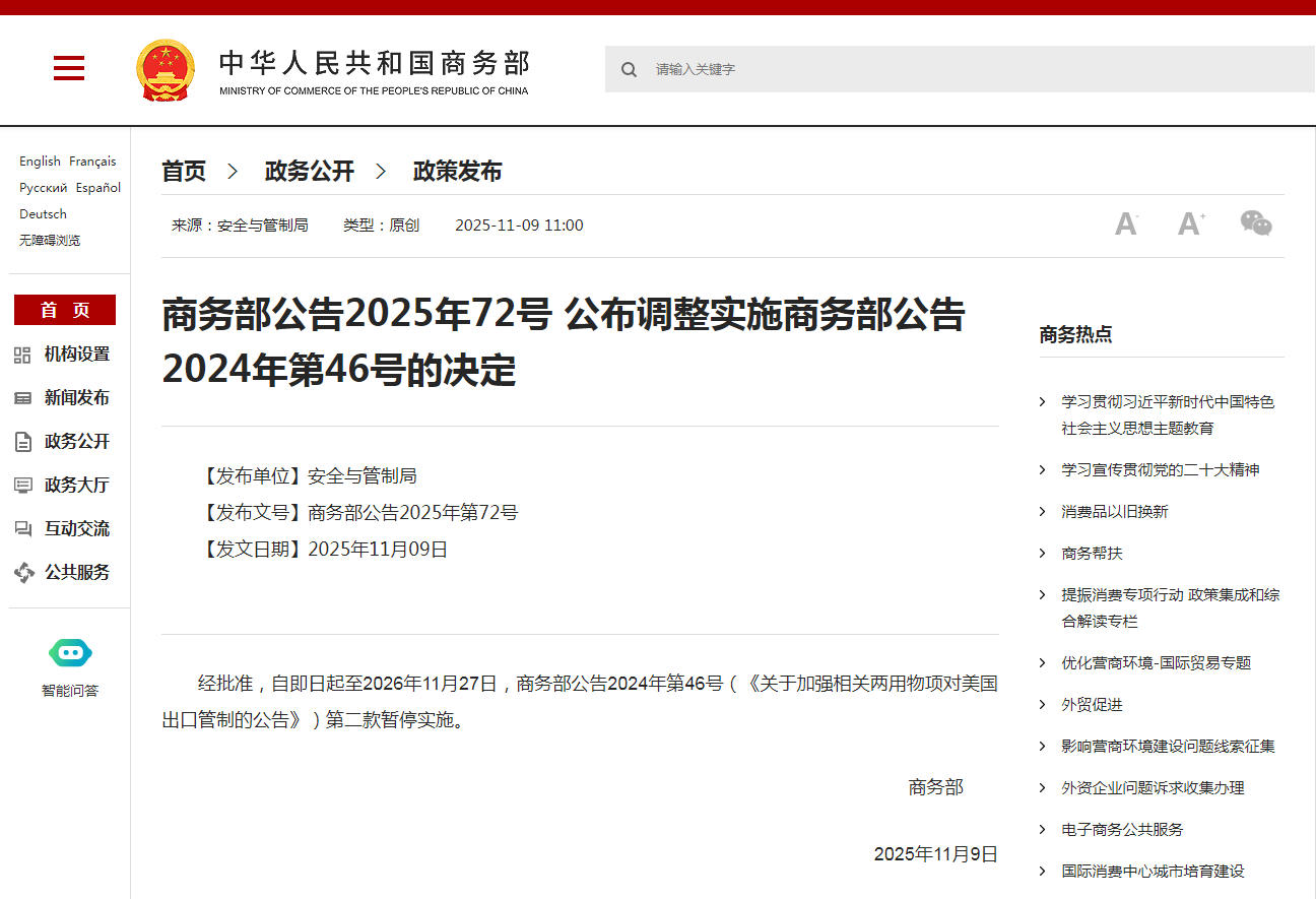 商务部:《关于加强相关两用物项对美国出口管制的公告》第二款暂停实施